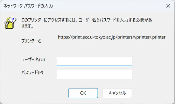 5. ユーザ名欄には「AD\+ユーザ名」を,パスワード欄にはそのパスワードを入力し,「OK」ボタンを押下してください.(ECCS2021 では多くの方のユーザ名は共通ID(UTokyo Accountの先頭10桁の数字のみの部分)です)