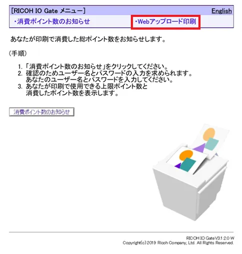 - Webブラウザで,RICOH IO Gateユーザーポータルサイト (print.ecc.u-tokyo.ac.jp)に接続し,画面のメニューにある「Webアップロード印刷」をクリックしてください.