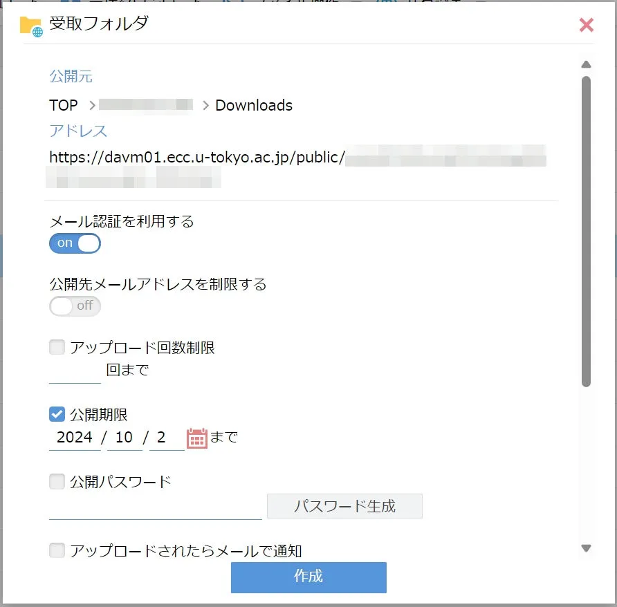 UTokyo AccountやECCS利用権を所持していない人から,指定したフォルダにファイルを受け取ることができる機能です.公開期限やパスワードを設定することも可能です.