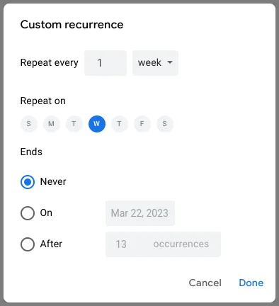 • There are various recurrence settings, and appointments can be specified down to the date and year.