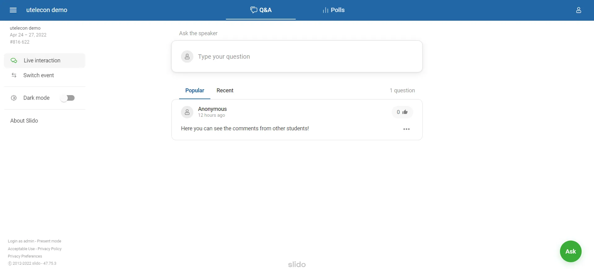 Slido can also be used as a bulletin board where students can post their comments as well as questions.