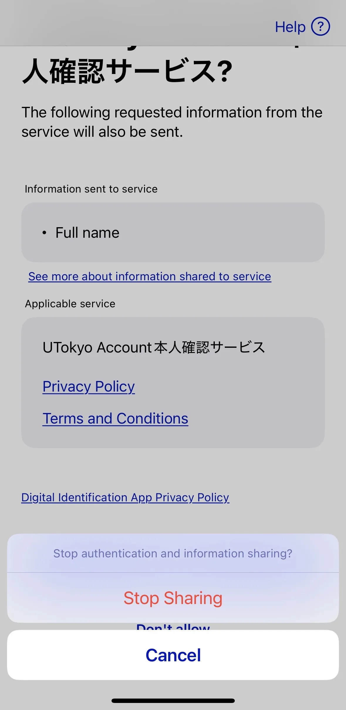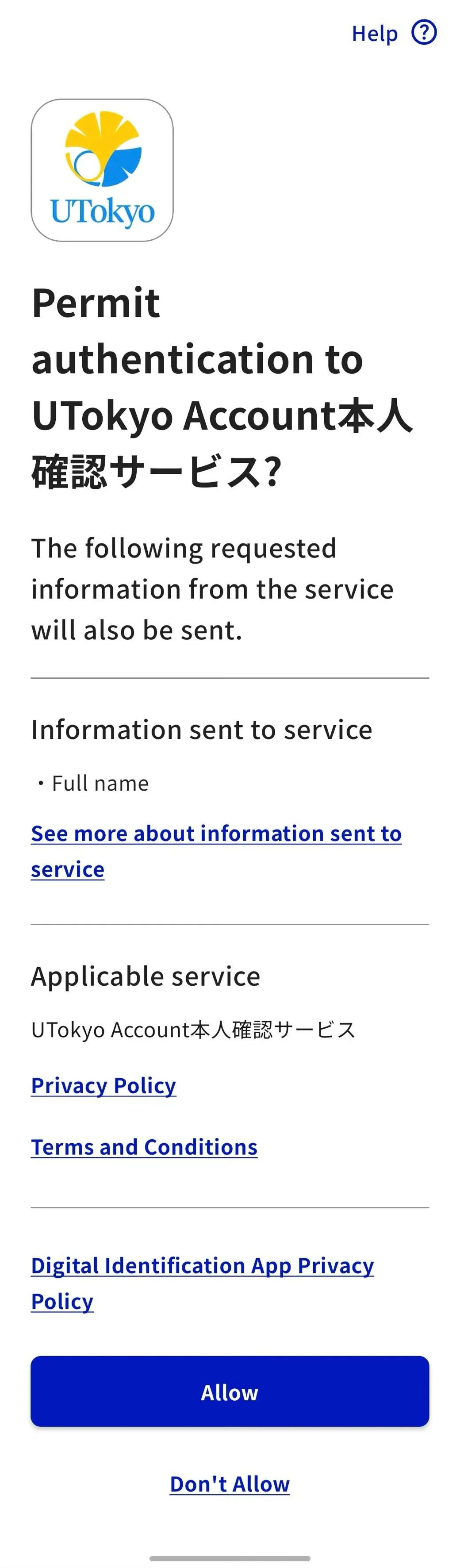 A screen will appear asking for permission to authenticate with the UTokyo Account Identity Verification Service. After reviewing the privacy policy and terms and conditions, tap “Allow.”