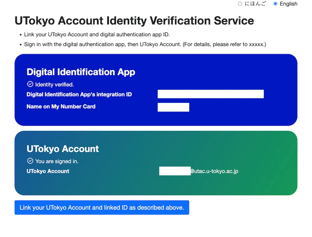 - On the UTokyo Account Identity Verification Service, confirm that your name and the linked UTokyo Account are displayed correctly.