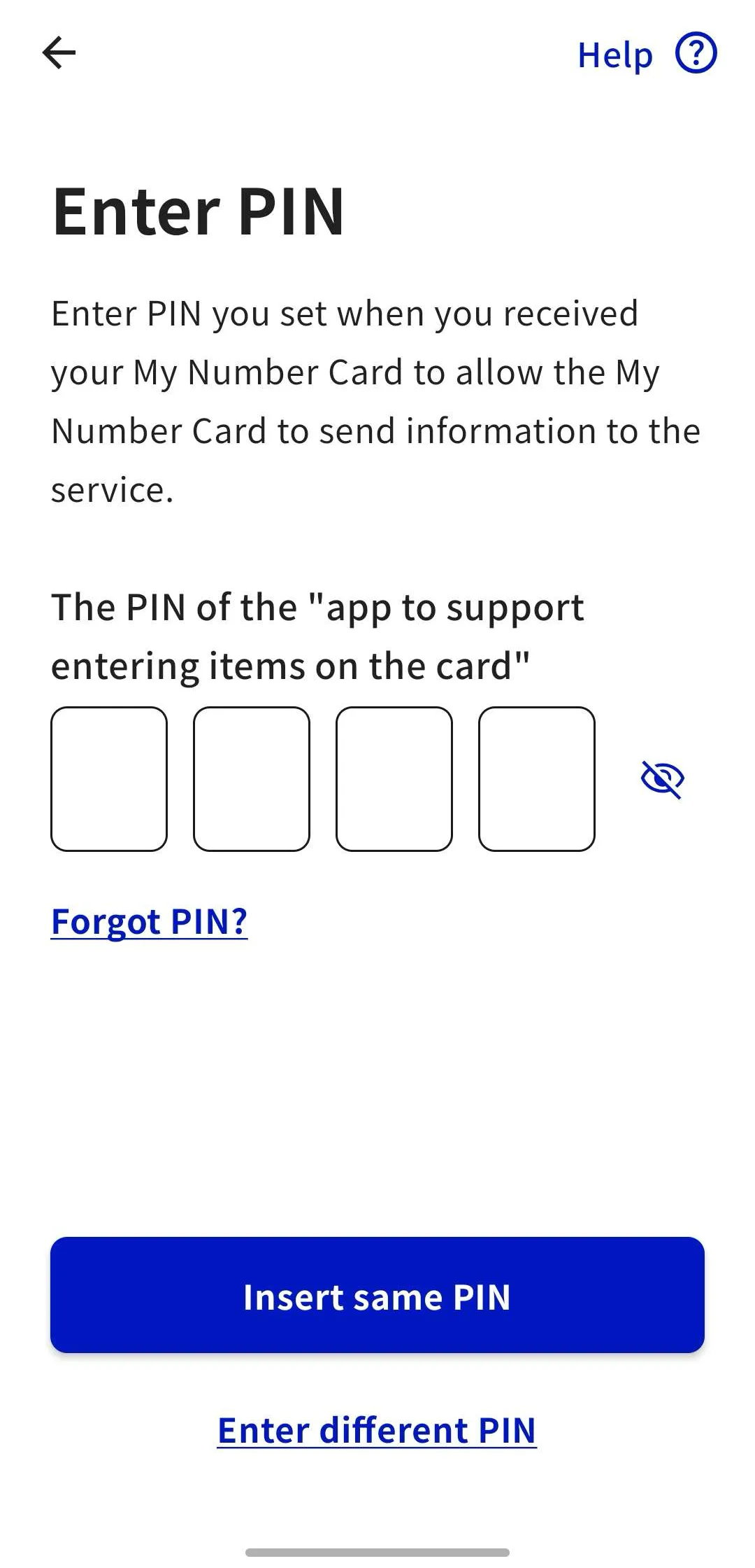 Enter the PIN of the “app to support entering items on the card” (previously referred to as “PIN for Card Info Input Support”). If it is the same as the previous PIN, you can skip this step by tapping “Insert same PIN.”
