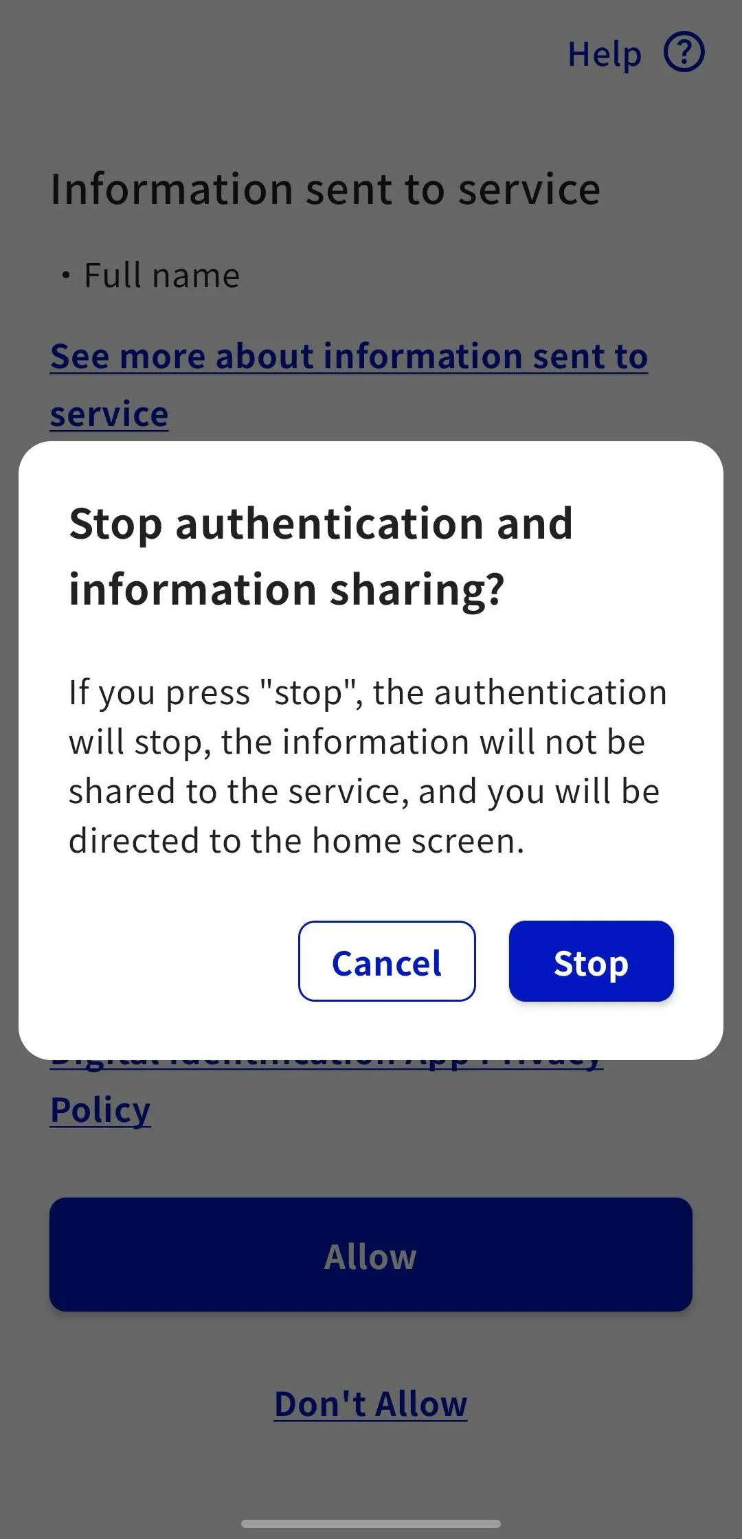 When a selection button appears asking, “Stop authentication and information sharing?”