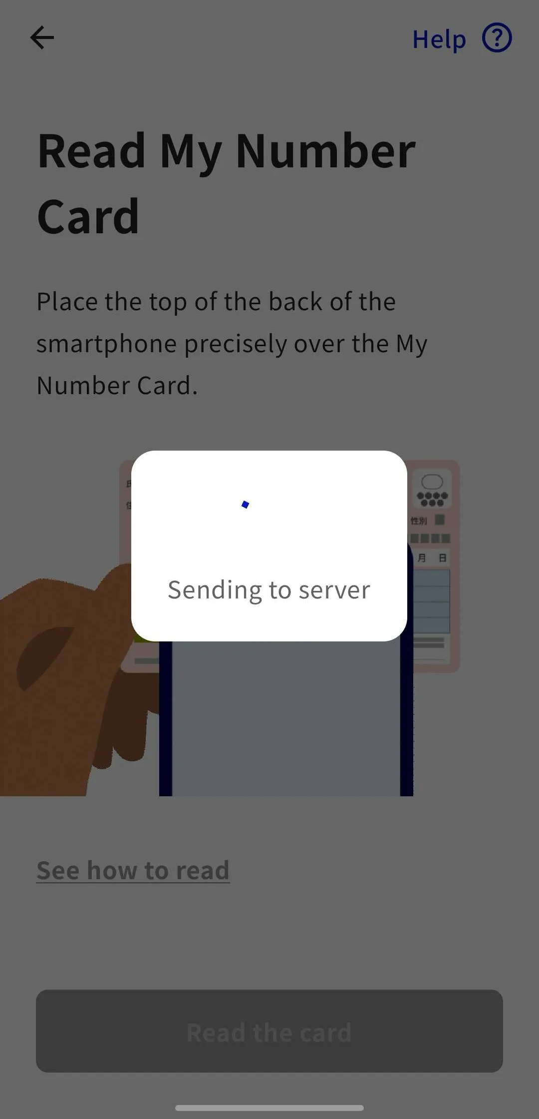 Follow the instructions in the app, tap the “Read the card” button, and scan your My Number Card with your smartphone.