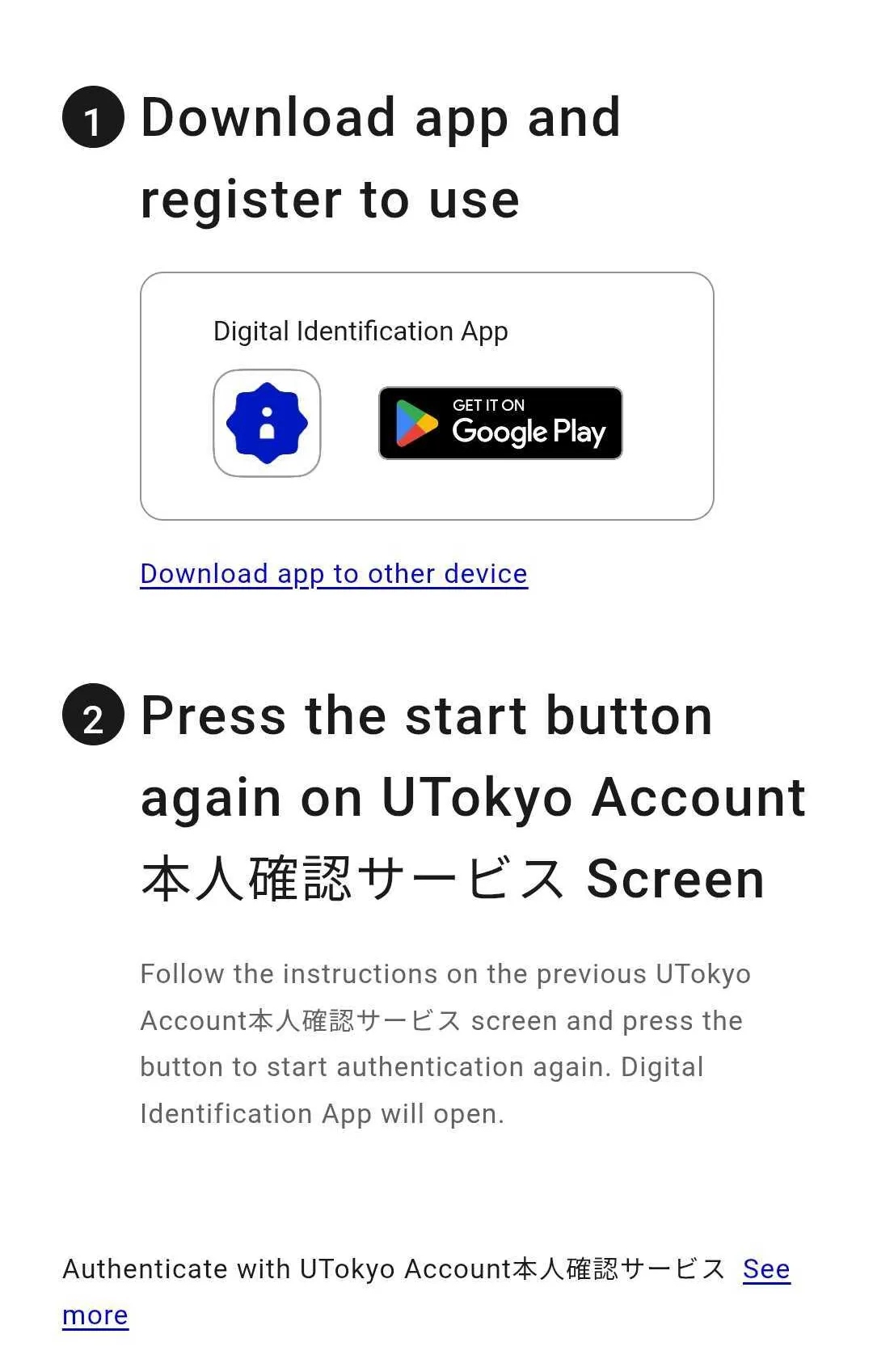 When accessing the UTokyo Account Identity Verification Service, the procedure in Step 2 differs depending on whether you use a PC (in case of using both a PC and a smartphone) or not (in case of using only a smartphone). We recommend completing the process using only a smartphone, as the procedure is more straightforward.