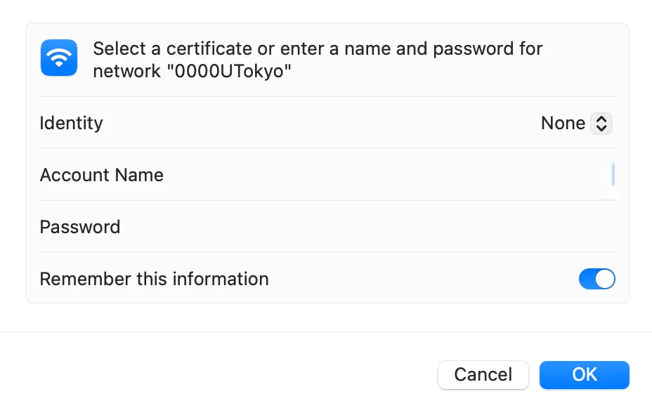 PasswordEnter the password for the UTokyo Wi-Fi