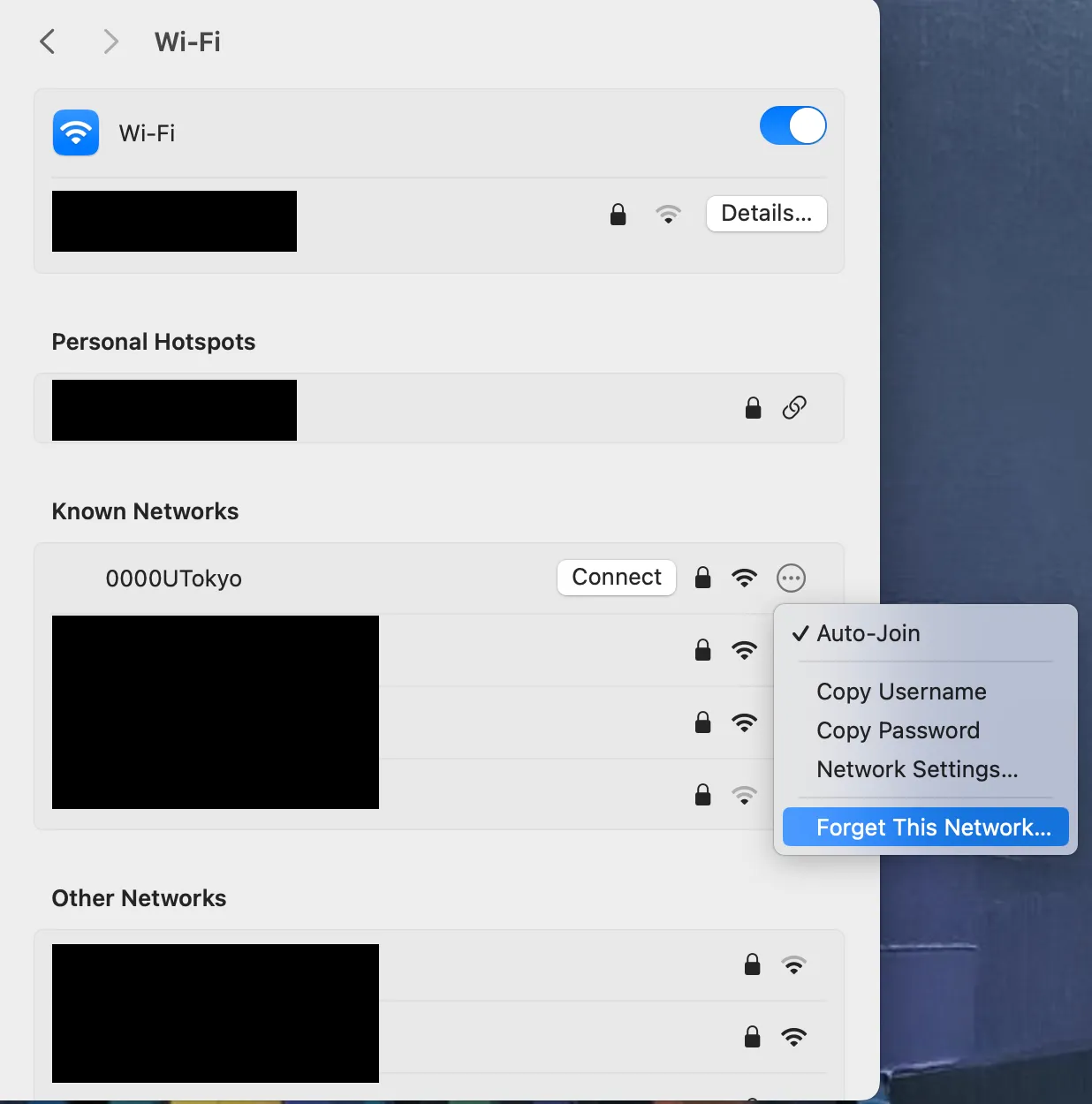 If the screen for entering a Account name and a password does not appear in Step 2 and it fails to connect to the Wi-Fi, you need to delete the existing setting and register a new one. This is necessary because although once you reissue your account and your previous account becomes invalid, your devices may still store it. Before using the new account, your devices must “forget” the previous one. There is no need to worry about never being able to connect to the UTokyo Wi-Fi again upon “deleting” a account.