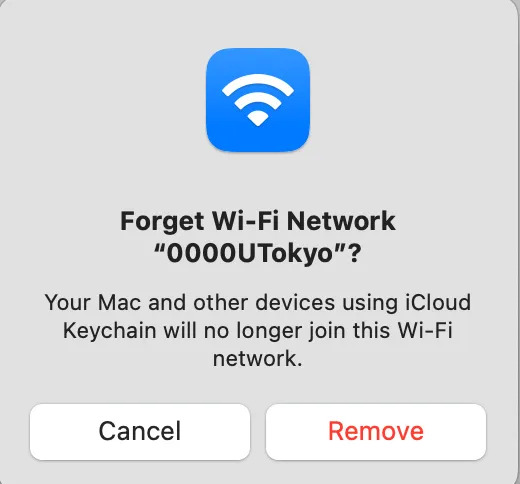 Select the SSID found in Step 2 and then select “Forget This Network” on the displayed screen. When a screen asking “Forget Wi‑Fi “0000UTokyo”?” appears, select “Remove”.
