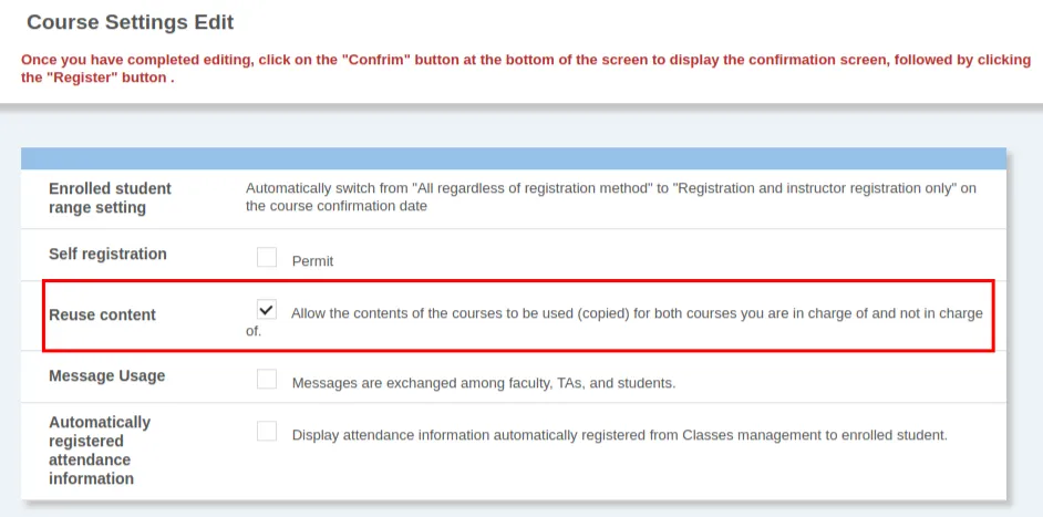 2. Check the option Allow the contents of the courses to be used (copied) for both courses you are in charge of and not in charge of.