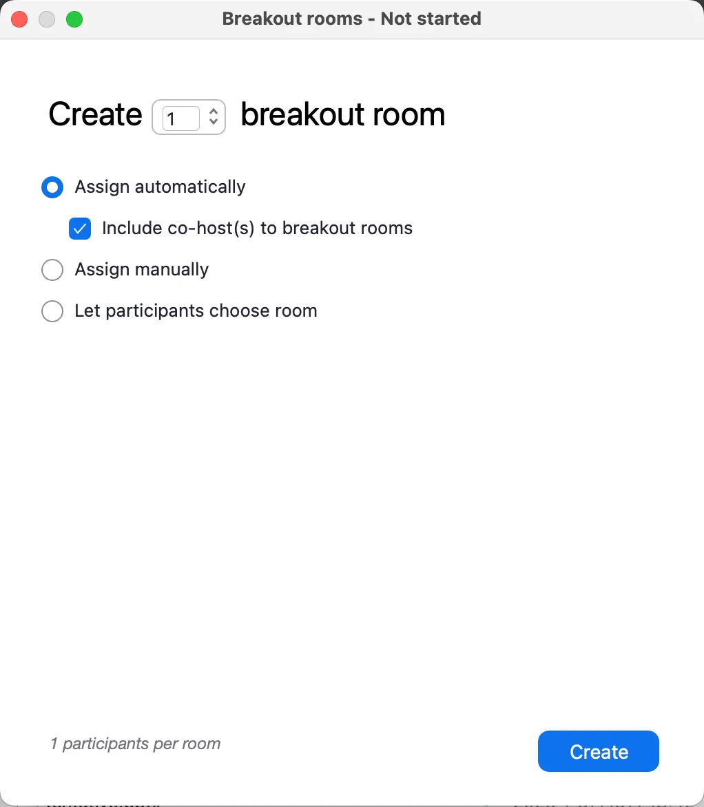 3. Click “Create” in the bottom right to create the breakout rooms.