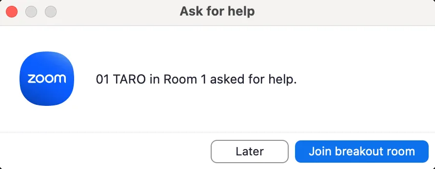 When the host receives a help request, a screen like the one below will appear, showing who is asking for help and from which breakout room. To respond to the request, click “Join breakout room” to enter that room.