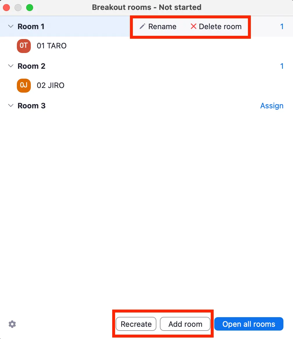 For assigned breakout rooms, you can rename or delete rooms, add new empty rooms, or recreate all rooms from scratch.