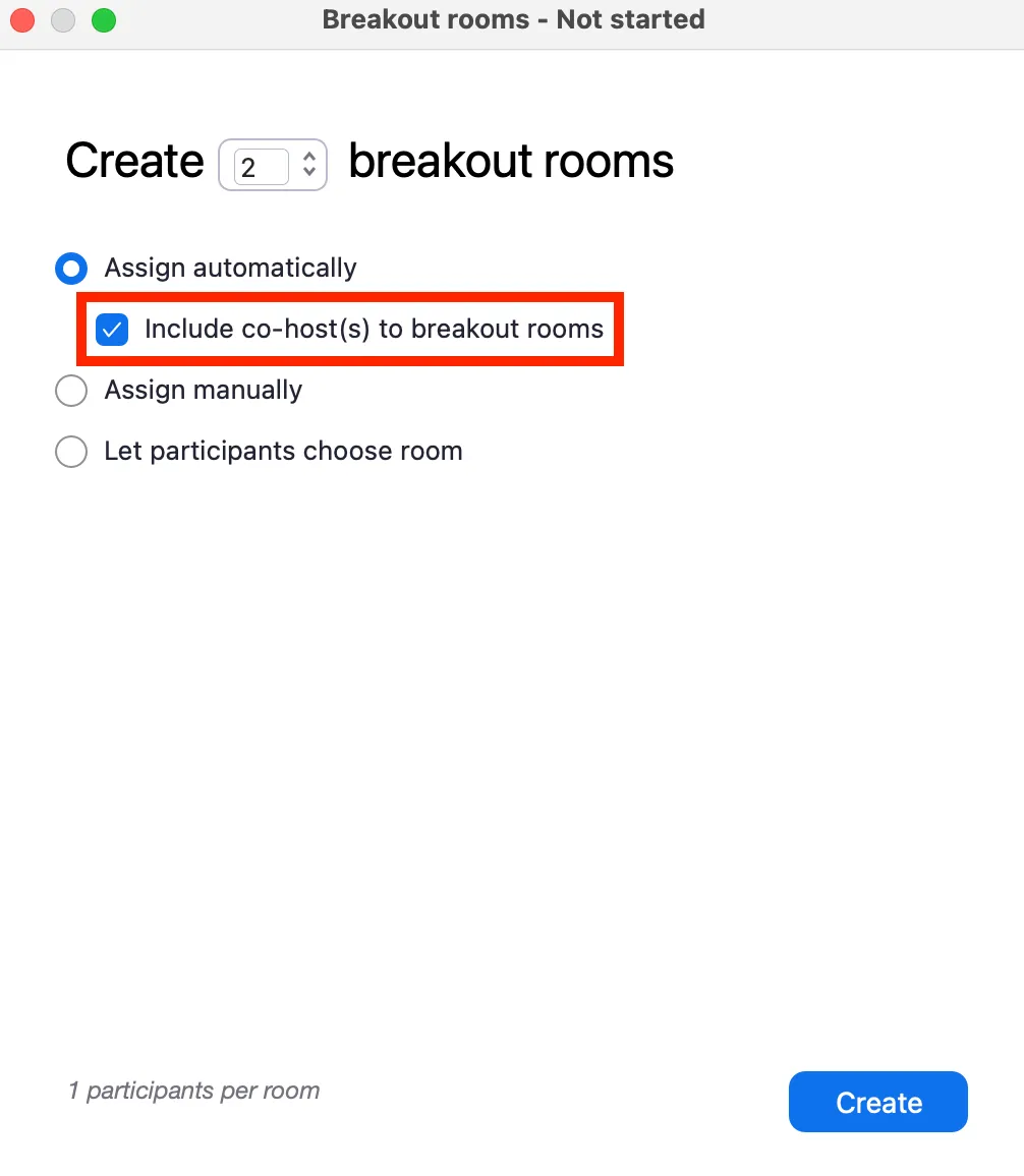 With “Assign manually”, the host or co-host assigns participants manually. With “Let participants choose room”, the participants select the room they want to join themselves. However, as described later, even if you choose “Assign manually”, you can also enable the “Let participants choose room” in the options, allowing the participants to select their own rooms after being assigned. Also, even if you choose “Let participants choose room”, the host or co-host can still assign participants manually.