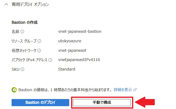 一部設定の変更が必要なので Bastion の作成で 手動で構成 をクリックする.