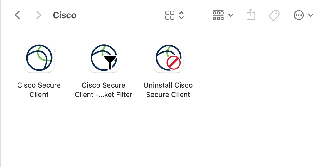 macOS 11 Big Sur以降のmacOSにCisco Secure Clientをインストールすると,「システム環境設定」→「ネットワーク」に以下のような Cisco Secure Client - Socket Filter という3つの拡張機能が追加されます.これらの拡張機能はUTokyo VPN接続時に通信を振り分けるために必要な機能として常駐しており,通信内容の記録やホスト外への情報送付も行いません.またこれらはUTokyo VPNに接続しているか否かに関わらず常時接続状態になります.