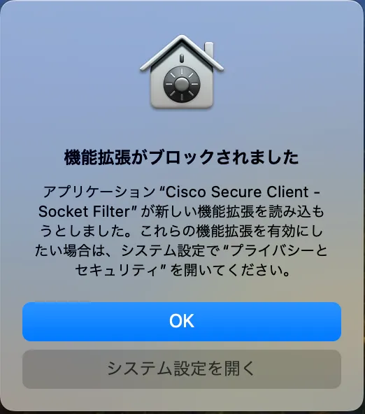 手順C: Cisco Secure Clientのインストールの途中で,以下のような「機能拡張がブロックされました」という画面が出る場合があります.その際は表示される手順にしたがって,「システム設定」→「プライバシーとセキュリティ」のペインに表示されている”Cisco Secure Client - Socket Filter”に関する許可を行なってください. また以下のような「“Cisco Secure Client - Socket Filter”がネットワークコンテンツのフィルタリングを求めています」という画面が表示されますので,これも許可してください.