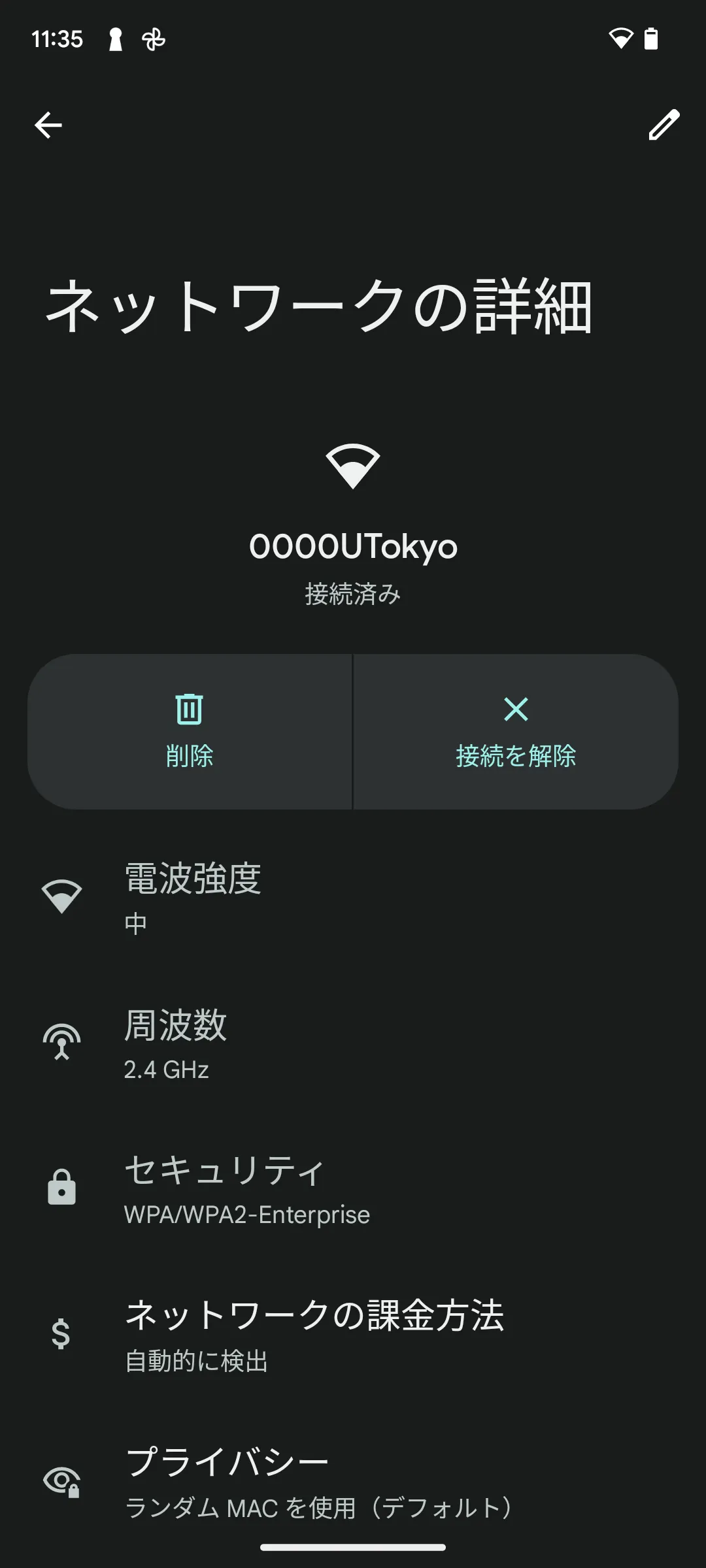 手順2でIDとパスワードを入力する画面が表示されず,接続にも失敗した場合は,既存の設定情報をいったん削除し,新しい設定情報を登録しなおす必要があります.なぜならば,アカウントを再発行すると従前のアカウントは使用できなくなりますが,端末はこの以前のアカウントのことをいわば「覚えて」しまっているからです.新しいアカウントを使用する前に,使用できなくなった古いアカウントのことを「忘れさせる」操作が必要です.「『削除』してしまうと二度とUTokyo Wi-Fiに接続できなくなってしまうのではないか」という心配は無用です.手順2で見つけたSSIDをタップし,「ネットワークの詳細」の画面を開きます.ネットワークの詳細画面で,設定情報をいったん削除してください.