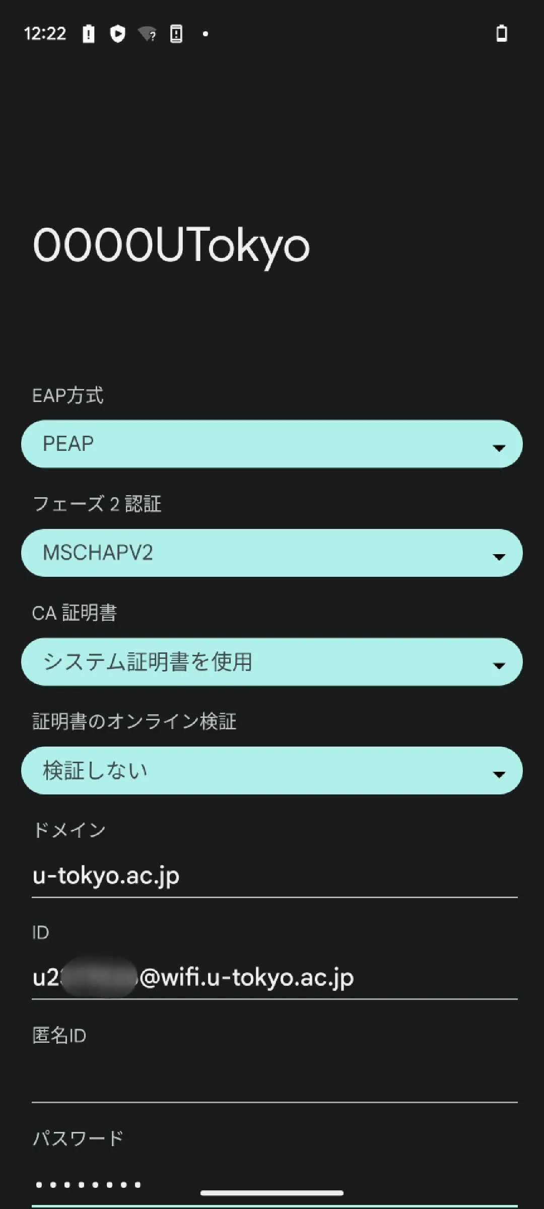 | ID | UTokyo Wi-FiのユーザーID(uから始まり@wifi.u-tokyo.ac.jpで終わるもの)を入力してください |