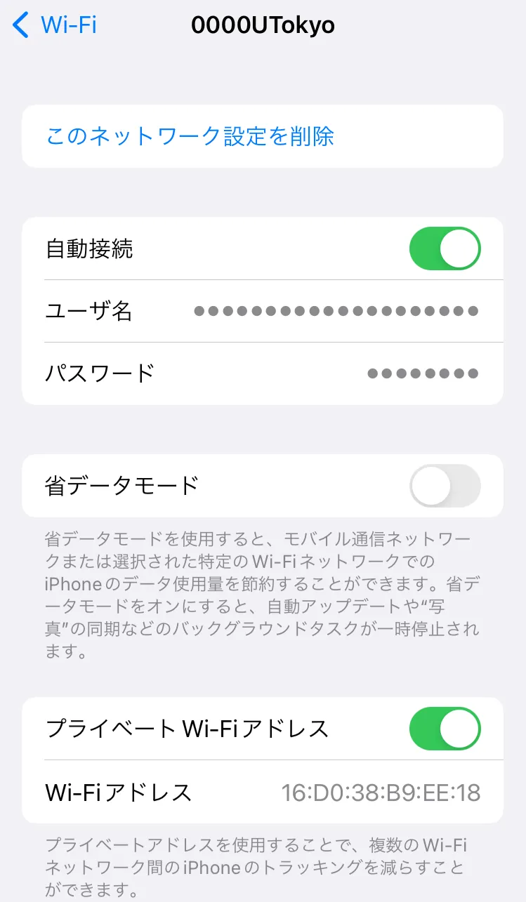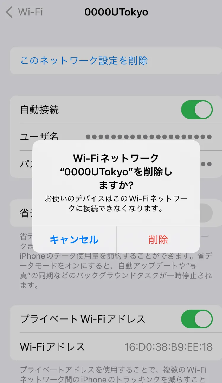 手順2で見つけたSSIDをタップし,「このネットワーク設定を削除」を選択してください.「Wi‑Fiネットワーク“0000UTokyo”を削除しますか?」という画面が出てくるので,「削除」を選択してください.