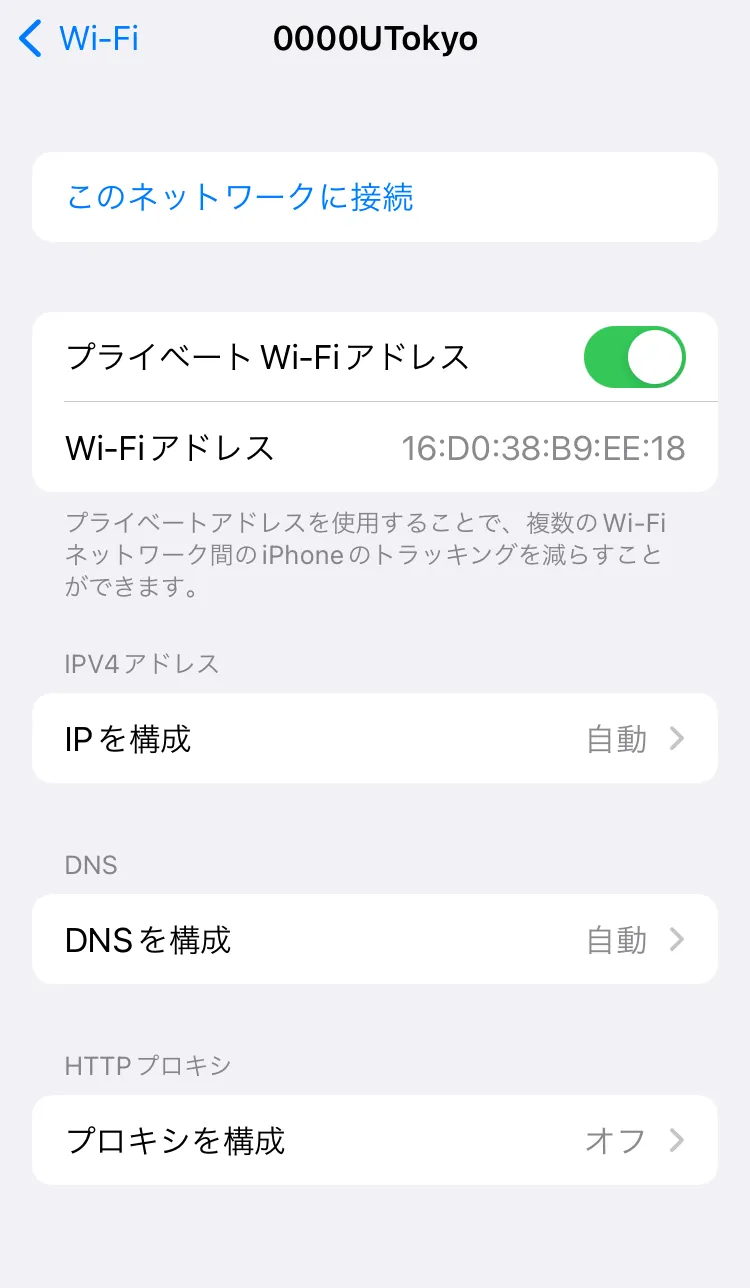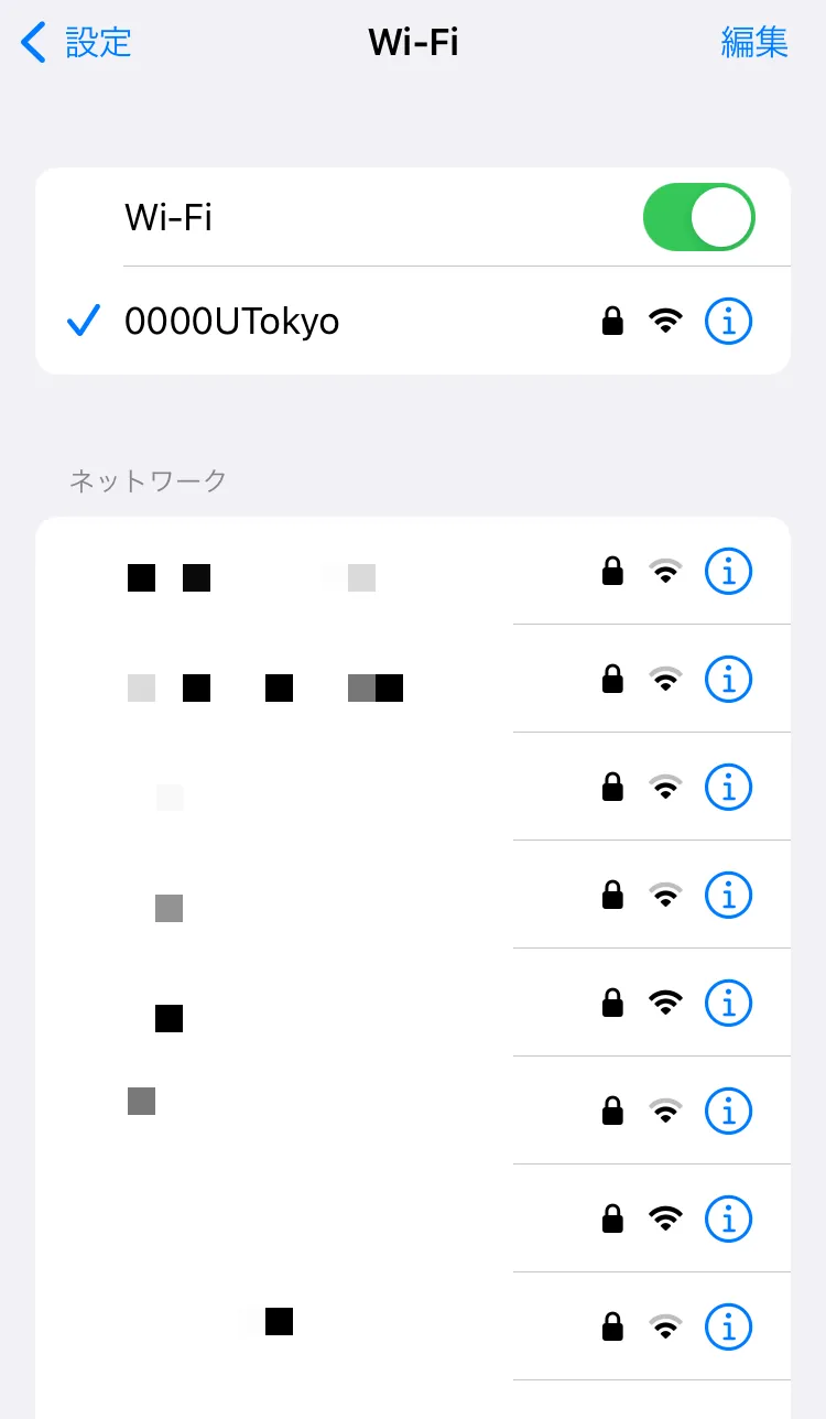 Wi-Fi機能をオンにして少し待つと,Wi-Fi接続設定画面にSSIDの一覧が表示されます.SSIDとは,Wi-Fiの信号を識別するための名前のことです.このSSIDの一覧の中から,0000UTokyoというSSIDを選択して接続してください.
