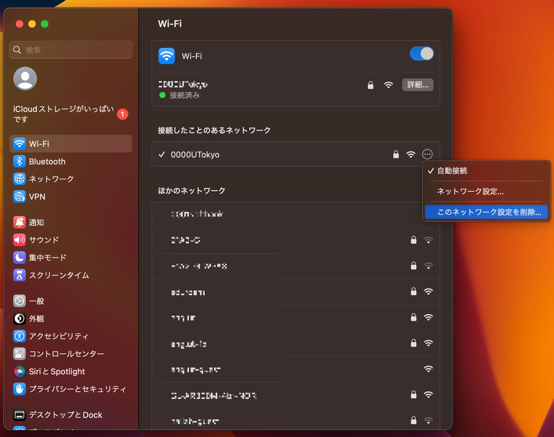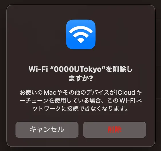手順2で見つけたSSIDを選択し,表示された画面で「このネットワーク設定を削除する」を選択してください.「Wi‑Fi “0000UTokyo”を削除しますか?」という画面が出てくるので,「削除」を選択してください.