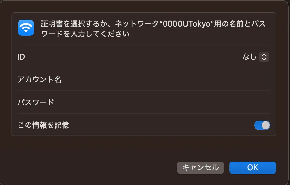 パスワードUTokyo Wi-Fiのパスワードを入力してください