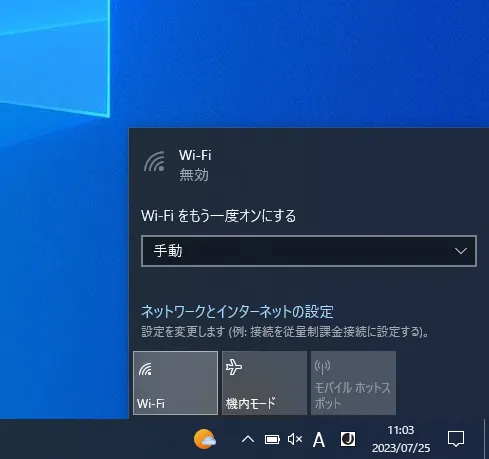 タスクバーの中から地球儀の形をしたアイコンを選択し,その中から扇型の「Wi-Fi」アイコンを選択してWi-Fi機能をオンにしてください.