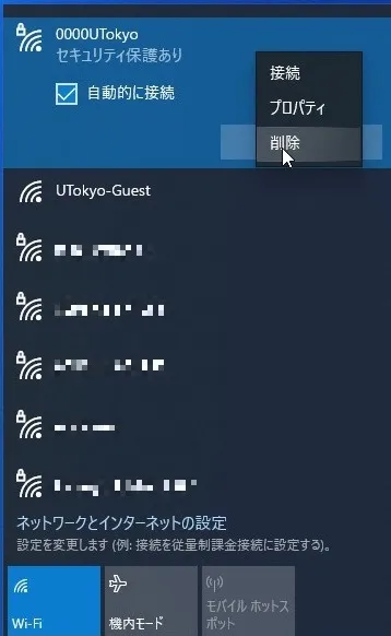 手順2でユーザー名とパスワードを入力する画面が表示されず,接続にも失敗した場合は,既存の設定情報をいったん削除し,新しい設定情報を登録しなおす必要があります.なぜならば,アカウントを再発行すると従前のアカウントは使用できなくなりますが,端末はこの以前のアカウントのことをいわば「覚えて」しまっているからです.新しいアカウントを使用する前に,使用できなくなった古いアカウントのことを「忘れさせる」操作が必要です.「『削除』してしまうと二度とUTokyo Wi-Fiに接続できなくなってしまうのではないか」という心配は無用です.手順2で見つけたSSIDを右クリックし,表示されたメニューの中から「削除」を選択してください.