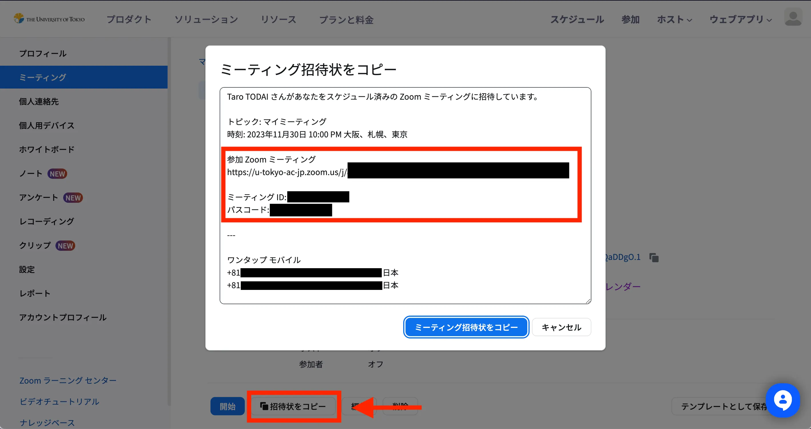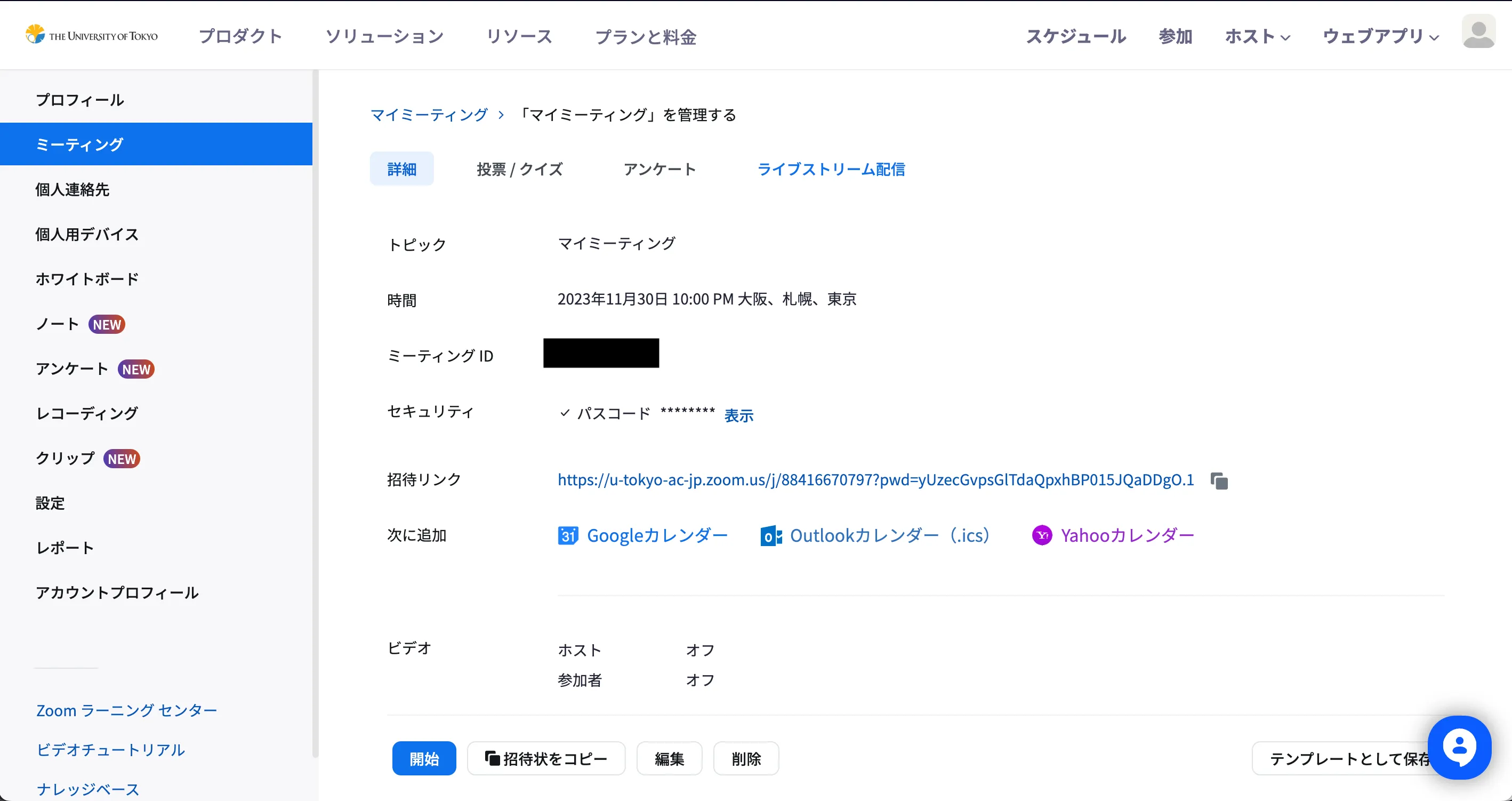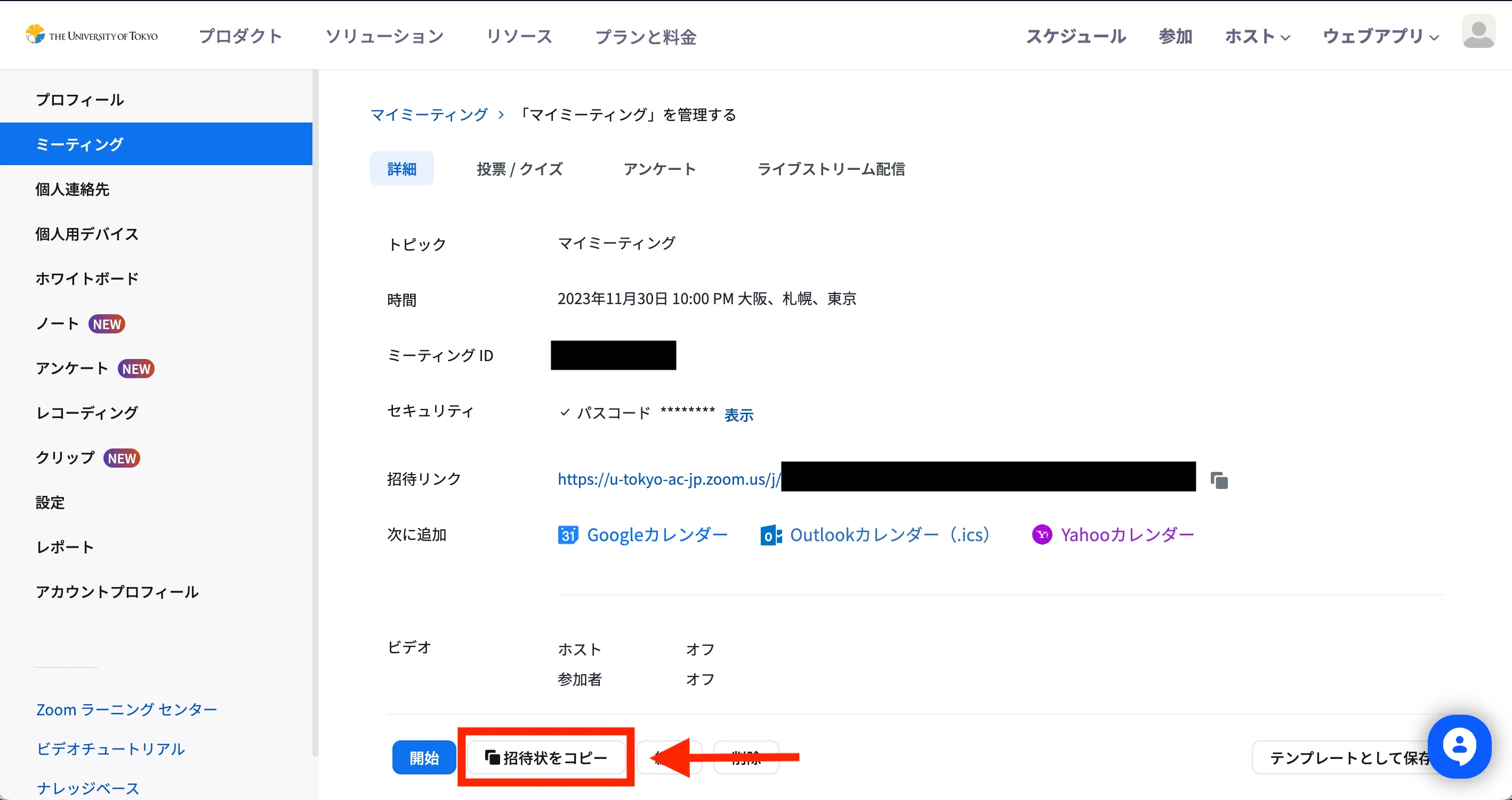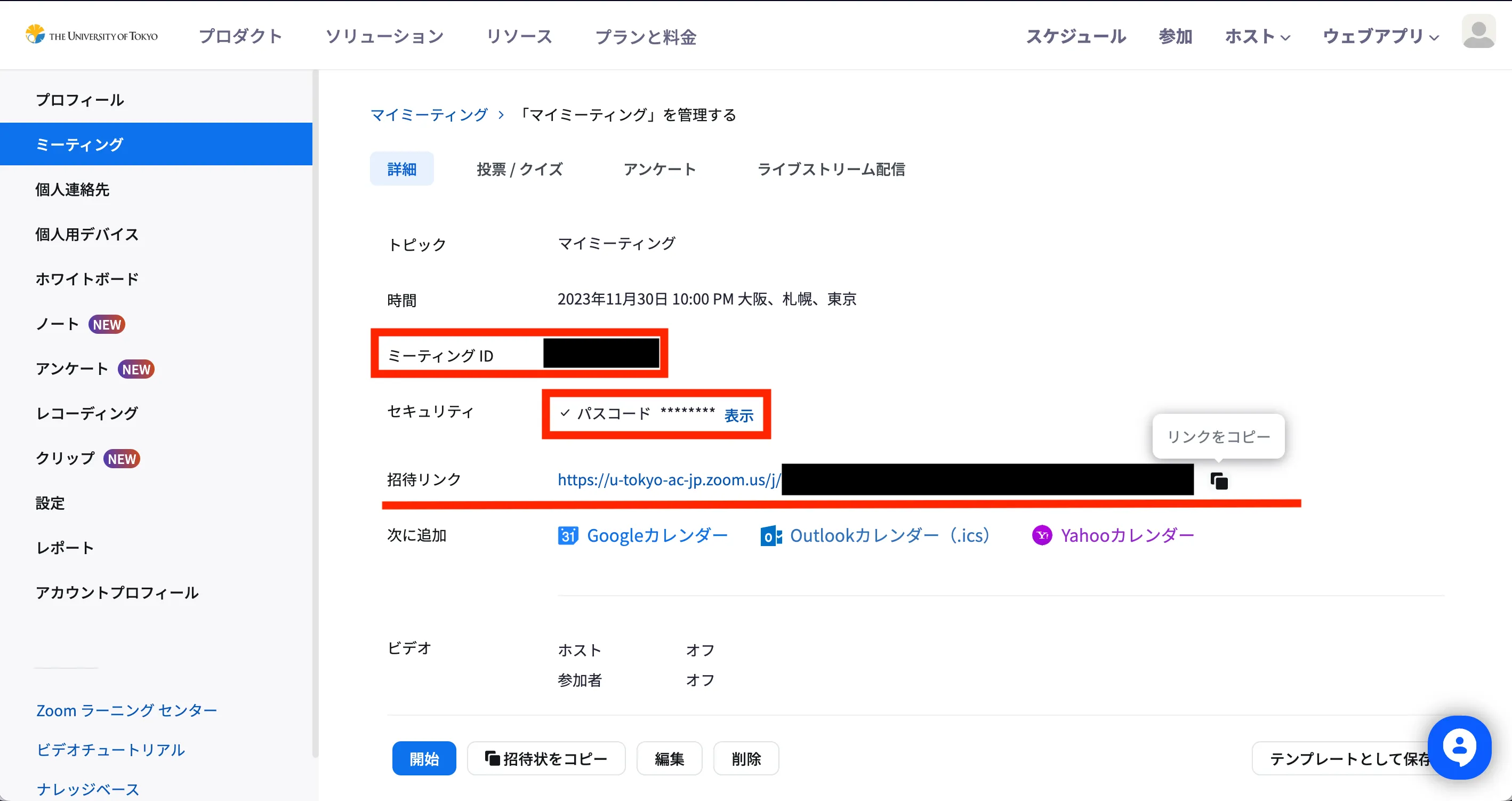 - 作成されたミーティングの詳細の画面に表示されている「招待リンク」をコピーして参加者に知らせてください.「招待リンク」に加えて,「ミーティングID」と「パスコード」も知らせておくと便利です.