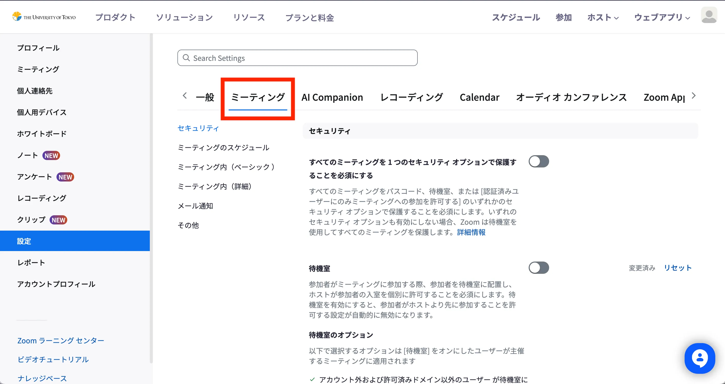 これらの機能の設定画面は,「マイ設定」ページ上段のタブの中から「ミーティング」を選択すると表示できます.