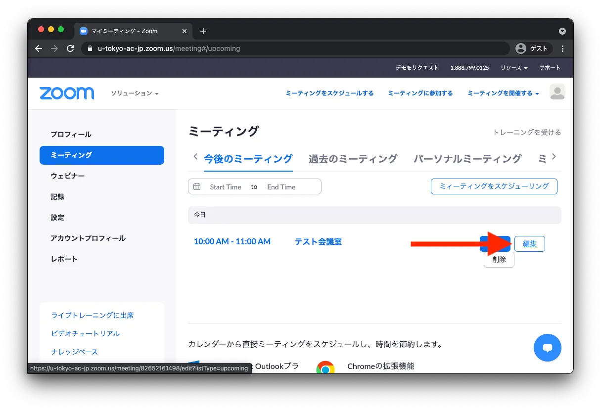• 以前に作成したミーティングの設定を確認・変更する場合は,一覧に表示されているミーティングにマウスを重ねると右側に「編集」ボタンが表示されるので,このボタンを押します.