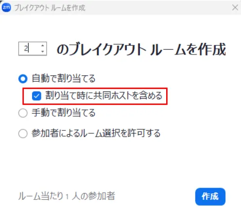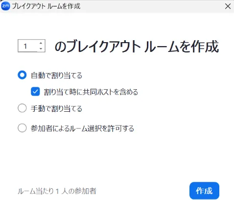 2. 次に,作成するブレイクアウトルームの数と,参加者をどのように割り当てるかを選択してください.