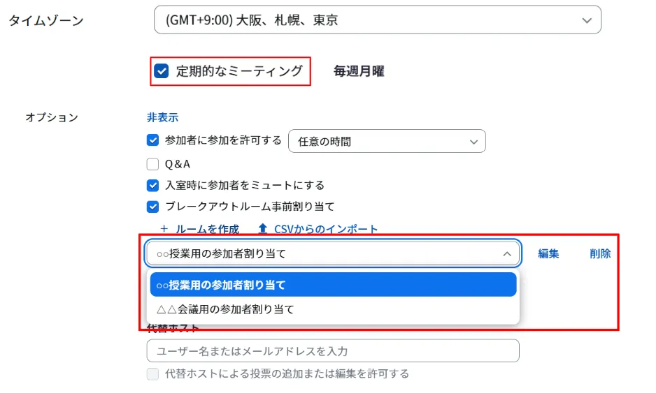 定期的なミーティングでは,「ルームを作成」と「CSVからのインポート」に加えて,以前のミーティングで保存した割り当てを利用して参加者をブレイクアウトルームに事前に割り当てることも可能です.この方法については,後述する「参加者の割り当てを保存する」で説明します.