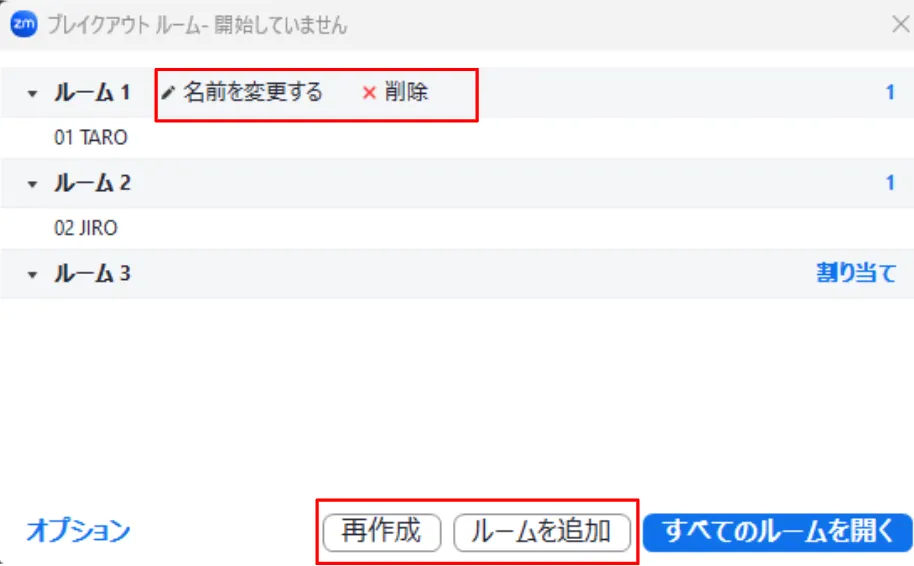 割り当て済みのブレイクアウトルームについて,ルーム名の変更や,ルームの削除,新たな空のルームの追加,そして全てのルームの再作成(やり直し)が可能です.