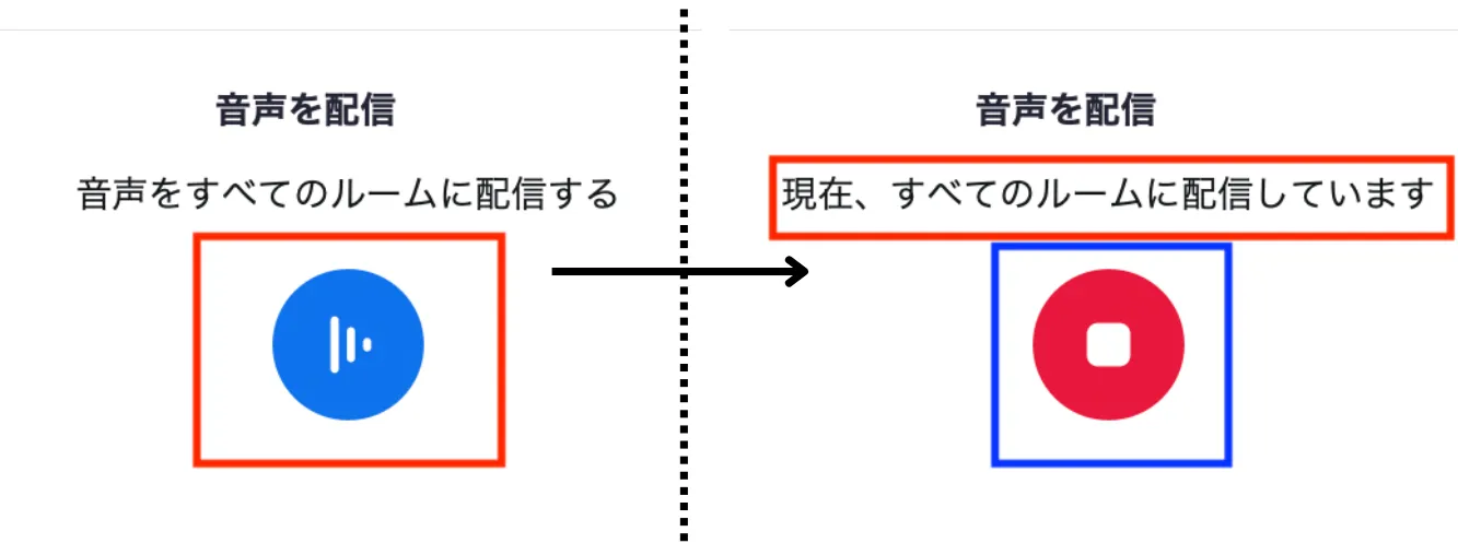 • 「音声を配信」する場合:ミュートが解除されていることを確認した後,音声配信アイコン(図中左赤枠のアイコン)を押してください.「現在、すべてのルームに配信しています」と表示されたら,正しく配信することができています.音声の配信を停止するときは,停止アイコン(図中青枠)を押してください.