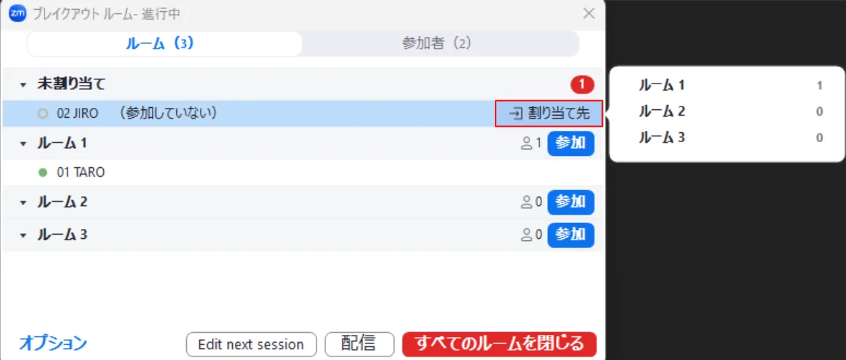 なお,ブレイクアウトセッションの開始後,ホストや共同ホストの画面には「未割り当て」という項目が表示されることがあります.ここに名前がある参加者はどのルームにも振り分けられずメインミーティングに残っていることになります.割り当てを行いたい場合は,名前の横にカーソルを合わせると出てくる「割り当て先」を押し,未割り当ての参加者を参加させるルームを選択してください.